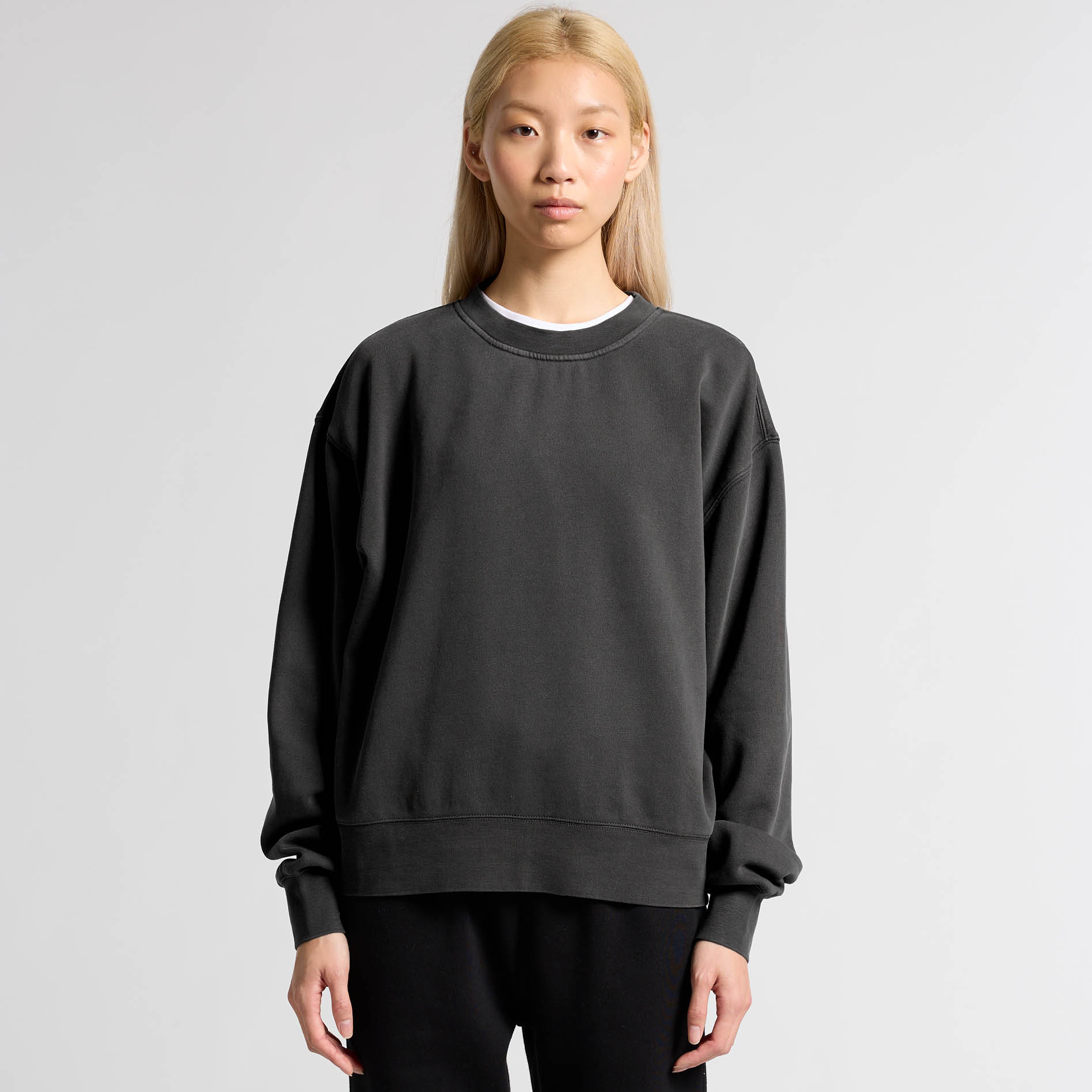 Pullover crew, drop shoulder, crew neck, garment dyed, sleeve cuff ribbing