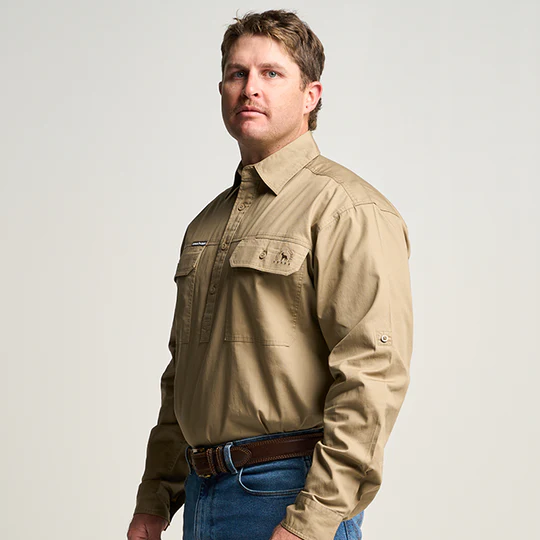 OBCMWS001-Khaki KILCOY | Mens Half Button Long Sleeve Work Shirt - Khaki